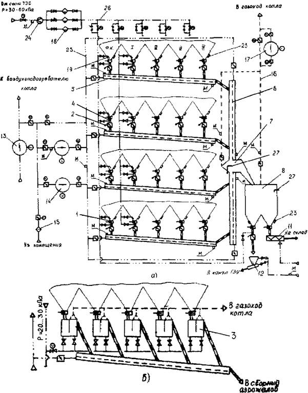 1 - шибер; 2 - клапан-мигалка; 3 - пневмослоевой затвор; 4 - золовая течка; 5 - подбункерный аэрожелоб; 6 - аэрожелоб сборный; 7 - воздухоотделительная камера; 8 - промежуточный бункер; 9 - механический переключатель; 10 - пневмослоевой (ПСП) переключатель; 11 - пневмовинтовой насос; 12 - золосмеситель; 13 - дутьевой вентилятор; 14 - вентилятор высокого давления; 15 - воздушный фильтр; 16 - отсосный воздуховод; 17 - пылевой вентилятор; 18 - масловлагоотделитель; 19 - аэрирующее устройство; 20 - перфорированная труба; 21 - лавсановая термообработанная ткань; 22 - проволока; 23 - люк; 24 - расходомерное устройство; 25 - трубопровод вентиляторного воздуха; 26 - трубопровод сжатого воздуха; 27 - датчик уровня; М - манометр
