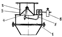 1 - воронка; 2 - корпус; 3 - направляющая втулка; 4 - шток; 5 - опорная рама; 6 - электропривод; 7 - выходной патрубок