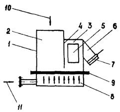 1 - корпус; 2 - опускная камера; 3 - подъемная камера; 4 - перегородка; 5 - смотровое окно; 6 - выходной патрубок; 7 - шибер; 8 - воздухоподводящая камера; 9 - перегородка аэрирующая; 10 - подача золы; 11 - подвод сжатого воздуха