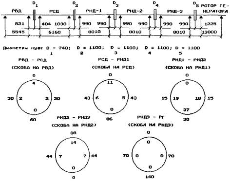 по известным значениям опорных нагрузок - высотные положения опор и значения расцентровок в районе муфтовых соединений с графическим изображением приведенных расцентровок условно разъединенных роторов;