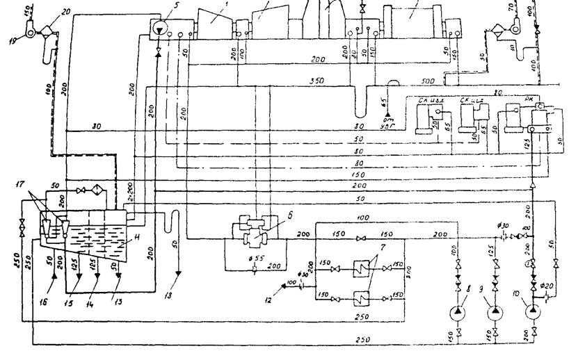 1 - цилиндр высокого давления; 2 - цилиндр среднего давления; 3 - цилиндр низкого давления; 4 - генератор; 5 - возбудитель; 6 - валоповоротное устройство; 7 и 10 - маслоохладители; 8 - эксгаустер; 9 - маслобак; 11 - основные маслонасосы; 12 - аварийные маслонасосы; 13 - редукционный клапан; 14 - масло на ПТН; 15 - масло к ПЭН; 16 - масло на ПСМ-3000; 17 - в дренажный бак Тп-22; 18 - опорожнение УВГ; 19 - в бак аварийного слива масла; 20 - от маслоочистительной установки