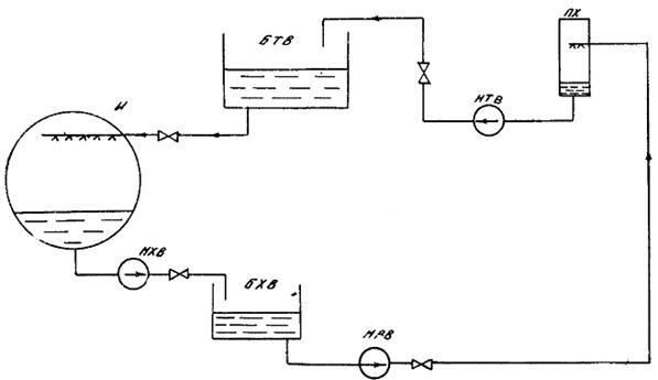 БХВ - бак холодного хладоносителя; НРБ - циркуляционный насос; НТВ - насос отепленного хладоносителя; БТВ - бак отепленного хладоносителя (Остальные обозначения см. рис. 4)