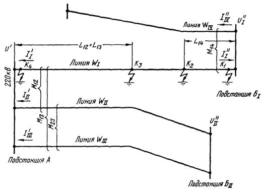 Для определения места КЗ на линии WI должны быть измерены токи на концах поврежденной линии и напряжения на концах всех ВЛ, имеющих электромагнитную связь с поврежденной. При работе всех ВЛ на общие секции (шины) количество измерений уменьшается и выражение (2.2) упрощается.