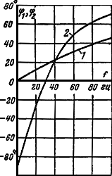 Совпадение фазовых углов токов определяется точкой пересечения кривых 1 и 2. Этой точке и соответствует частота подведенного к реле напряжения f0, при которой вращающий момент на реле меняет свой знак.