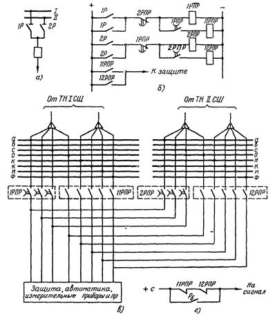 - переключение цепей напряжения присоединений РУ с ТН одной системы шин на ТН другой системы шин блок-контактами разъединителей применять только в распределительных устройствах 6 - 35 кВ. В РУ 110 кВ и выше должны применяться схемы с реле-повторителями положения разъединителей;