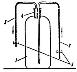 1 - полиэтиленовый сосуд; 2 - трубка для подвода анализируемой воды; 3 - трубка для отвода анализируемой воды; 4 - пробка; 5 - зажимы.