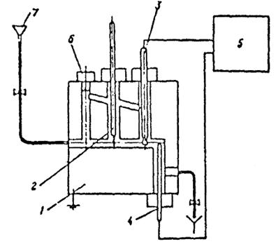 1 - поглотительная колонка; 2 - резиновая трубка, присоединенная к ячейке; 3 - резиновая трубка, присоединяемая к поглотительной колонке; 4 - сосуд с пробой; 5 - измерительная ячейка; 6 - рН-метр; 7 - слив