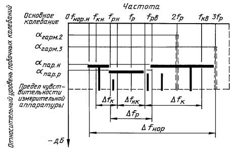 Рисунок 1 - Характерные значения частот, диапазонов частот, уровней колебаний на гармониках и паразитных колебаний