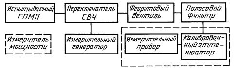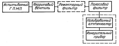 1 - согласованная нагрузка; 2 - дополнительный генератор; 3 - ферритовый вентиль; 4 - фильтр; 5 - аттенюатор; 6 - измерительный приемник; 7, 10 - экранированная камера; 8 - контролируемый генератор; 9 - устройство регулируемой связи