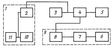 1, 9 - экранированная камера; 2 - устройство регулируемой связи; 3 - контролируемый ГПМП СВЧ; 4 - направленный ответвитель; 5, 11 - согласованная нагрузка; 6 - измерительное устройство (приемник); 7 - аттенюатор; 8 - фильтр; 10 - дополнительный генератор