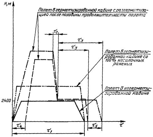 В течение половины продолжительности полета на высоте 2400 м в разгерметизированной кабине |