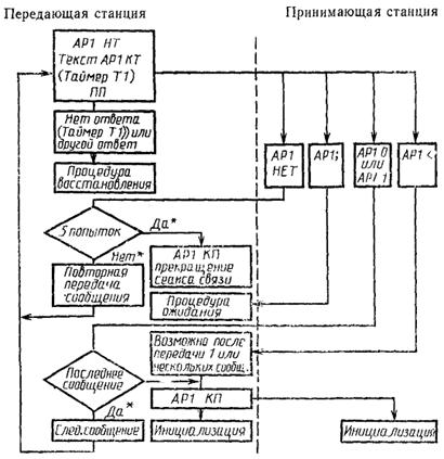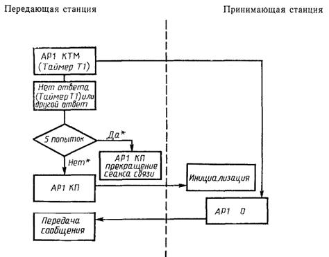 Принимающая станция инициализирует выдержку времени (равную удвоенному времени передачи блока) при получении ею управляющей последовательности AP1 HT. Если за это время не приходит управляющая последовательность AP1 KT, то принимающая станция не передает подтверждения и ждет приема.