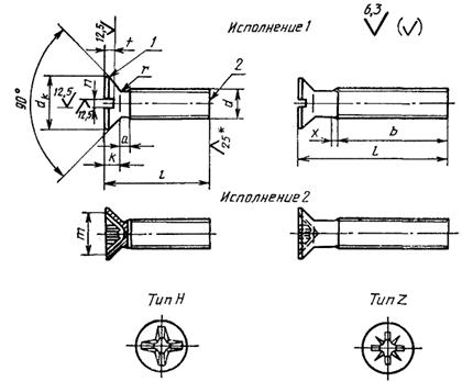 Конструкция и размеры винтов должны соответствовать указанным на чертеже и в табл. 1 и 2.