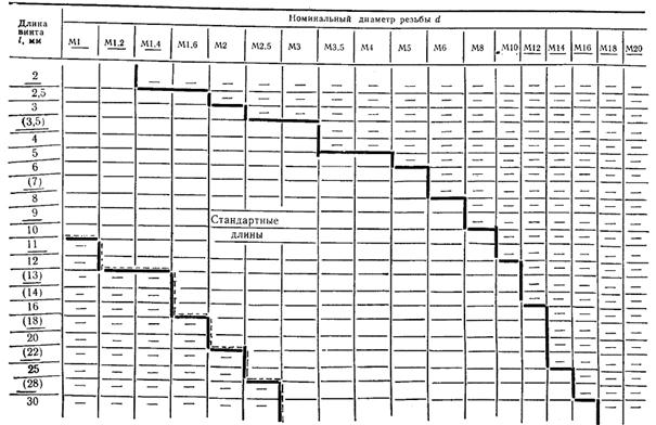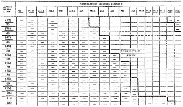 Примечание. Для определения массы винтов из алюминиевого сплава величины масс, указанные в таблице, следует умножить на коэффициент 0,356, из латуни - на 1,08.