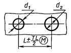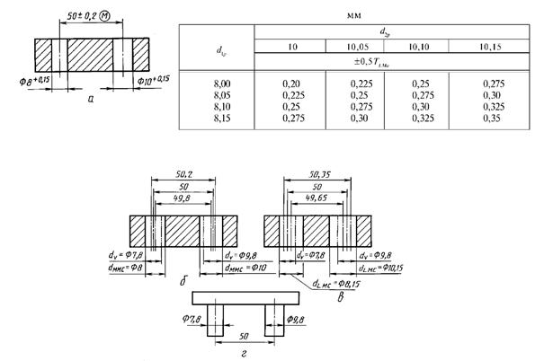 Схема калибра для контроля расстояния между осями двух отверстий, реализующая предельные действующие контуры отверстий, приведена на рисунке 13г.