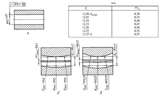 - если размеры по сопряжению и все местные размеры элементов выполнены по пределу минимума материала (dp = 39,75 мм; dpo = 16,18 мм), то ТР′ма = Ø 0,63 мм (максимальное значение зависимого допуска, рисунок 10в).