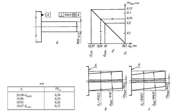 - если диаметр выступа по сопряжению выполнен равным наибольшему предельному размеру Dммс = 20 мм, то допуск перпендикулярности оси составит 0,2 мм (минимальное значение зависимого допуска, рисунок 6в);
