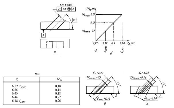 - если ширина паза по сопряжению равна наименьшему предельному размеру dммс = 6,32 мм, то допуск наклона плоскости симметрии паза составит 0,1 мм (минимальное значение зависимого допуска, рисунок 7в);
