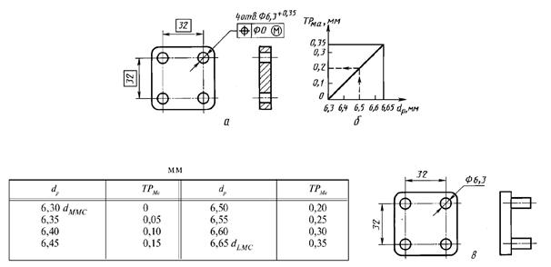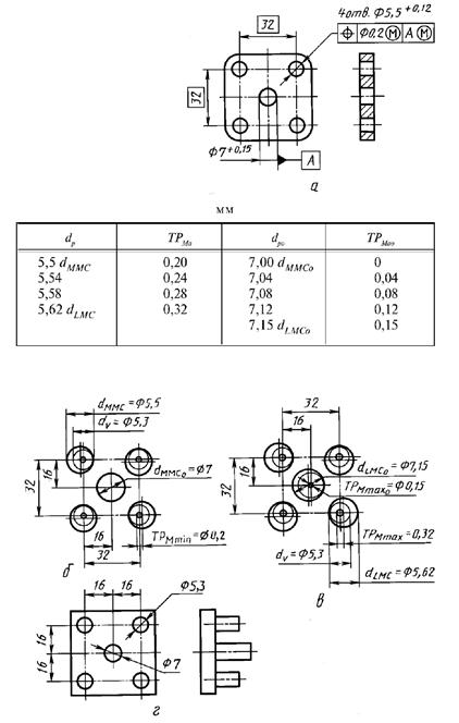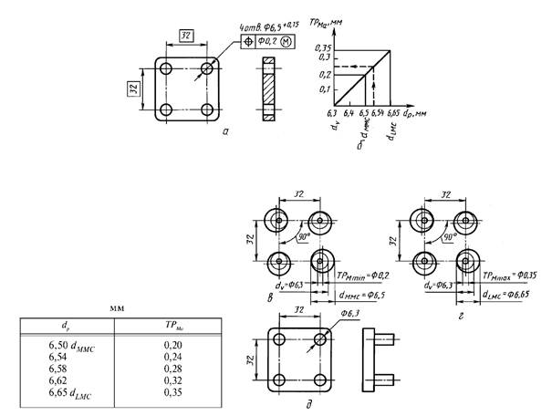 оси которых занимают номинальное расположение (в точной прямоугольной решетке с размером 32 мм); центральная ось симметрии решетки совпадает с осью базового отверстия, если его размер по сопряжению выполнен по наименьшему предельному размеру (dммсо = 7 мм). Действительные значения зависимого позиционного допуска оси каждого рассматриваемого отверстия ТРма в зависимости от диаметра по сопряжению соответствующего отверстия приведены в таблице на рисунке 12 и изменяются от Ø 0,2 мм (при dммс = 5,5 мм) до Ø 0,32 мм (при dLMc = 5,62 мм), рисунок 12б, в;