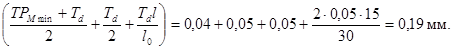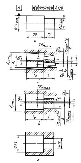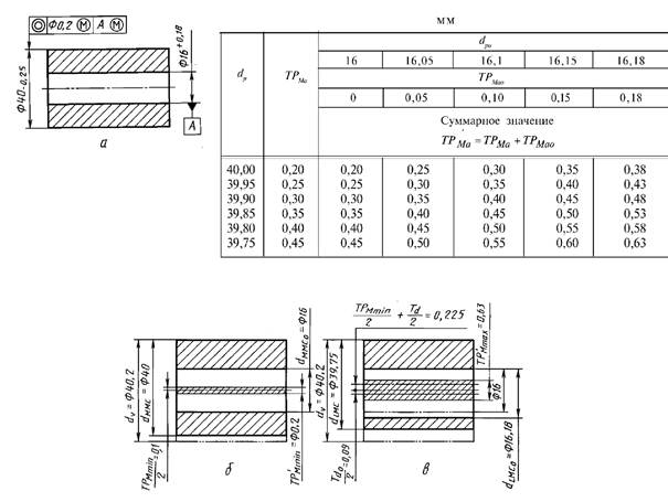 - если размеры по сопряжению элементов выполнены по пределу максимума материала (dp = 40 мм, dpo = 16 мм), то ТР′ма = Ø 0,2 мм (минимальное значение зависимого допуска, черт. 10б);