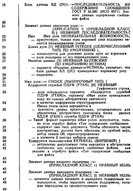 Информация структурирования (т.е. значения элементов типа «Элемент данных структурирования») передается в контексте блока данных БДДФ (FADU) службы ПДУФ (FTAM) (значение, соответствующее абстрактному синтаксису блока данных БДДФ (FADU) службы ПДУФ (FTAM), см. п. 7.3). Имена узлов находятся или в этом же контексте или другом, входящем в него контексте. Значения элементов типа «Элемент данных содержания сообщения файла» передаются в контексте уровня представления содержания сообщения файла.