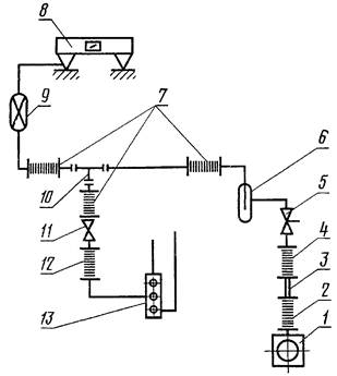 1 - вакуумный насос; 2, 4, 7, 12 - резиновые вакуумные трубки; 3 - металлическая труба; 5 - трехходовой кран; 6 - ловушка; 8 - вакуумметр; 9 - манометрический преобразователь; 10 - тройник; 11 - двухходовой кран; 13 - струбцина