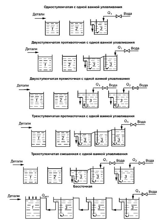 5 При работе с горячими ваннами можно применять противоточные бессточные схемы промывок. Число ступеней для схем вычисляют по формуле