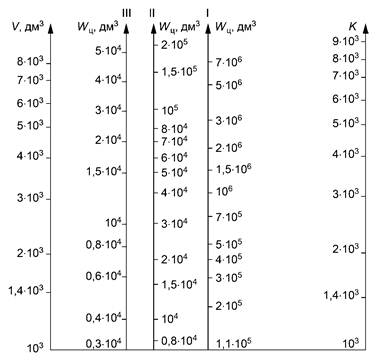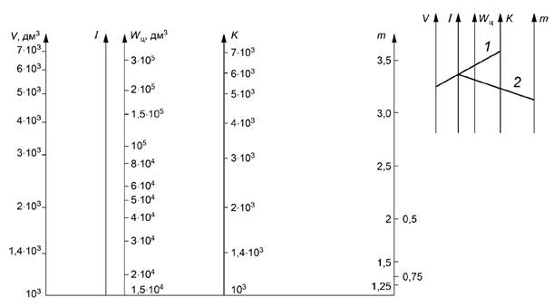 Примечание - Для определения объема воды на промывку для одного цикла необходимо соединить заданные значения V и K (прямая 1), затем заданное значение т соединить с точкой пересечения прямой V-K с осью I (прямая 2). Точка пересечения прямой 2 с осью Wц соответствует объему воды на промывку для одного цикла.