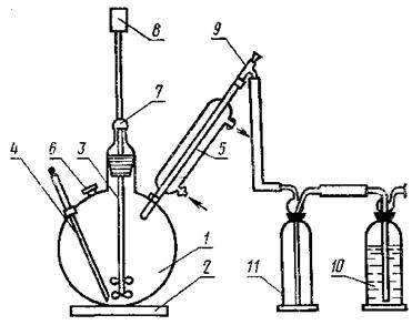 1 - реакционная колба; 2 - регулируемая электроплитка с водяной баней; 3 - электрическая мешалка со шлифом; 4 - термометр; 5 - обратный холодильник; 6 - отверстие дозировки исходных продуктов; 7 - резиновое уплотнительное кольцо; 8 - электромотор; 9 - аллонж, соединяющий холодильник с поглотительной системой; 10 - поглотительная склянка Дрекселя, заполненная раствором гидроокиси натрия концентрацией 100 г/л; 11 - буферная емкость (пустая склянка Дрекселя)