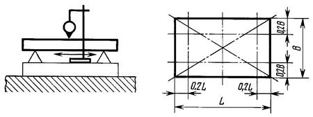 Измерения - по ГОСТ 22267-76 (разд. 4, метод 3) не менее чем в двух продольных, трех поперечных и двух диагональных сечениях стола (плиты). Крайние сечения должны быть расположены от края стола на расстоянии 0,2 ширины В или длины L стола (плиты) - см. черт. 1.