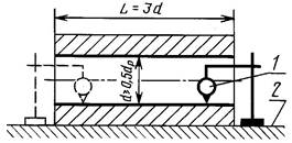 Образец устанавливают боковой гранью на контрольную плиту 2 и с помощью показывающего измерительного прибора 1 измеряют расстояние от плиты до нижней образующей отверстия у обоих торцев (черт. 12).