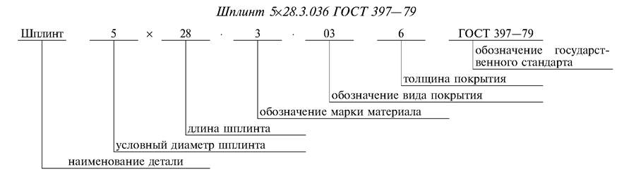6.1. Шплинты следует обозначать по схеме, указанной на примере шплинта с условным диаметром 5 мм, длиной 28 мм, из латуни Л63 с никелевым покрытием толщиной 6 мкм.