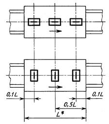 Расстояние между точками измерения равно а ≈ 0,1 L, b ≈ 0,1 В, но не более 1000 мм в продольном направлении и не более 500 мм в поперечном направлении.