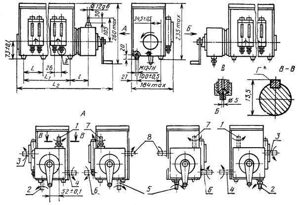 В станциях исполнения 3 редуктор может быть установлен в одном из четырех положений поворотом на 90, 180 и 270° относительно оси эксцентрикового вала станции, при этом свободный конец вала редуктора относительно устройства визуального контроля будет расположен: 1 - вверх со смещением к задней стенке корпуса; 2 - вниз со смещением к передней стенке корпуса; 3 - вперед вверху; 4 - назад внизу; 5 - вниз со смещением к задней стенке корпуса; 6 - вперед внизу; 7 - вверх со смещением к передней стенке корпуса; 8 - назад вверху.