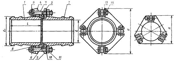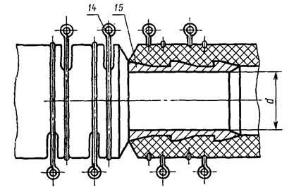 1 - ниппель; 2 - ниппель; 3 - упорное кольцо; 4 - подвижный фланец; 5 - неподвижный фланец; 6 - прокладка; 7 - болт откидной по ГОСТ 3033-79; 8 - ограничительное кольцо; 9 - цапфы; 10 - шайбы черные диаметром 16 и 20 мм по ГОСТ 11371-78; 11 - гайки М20 и М16 по ГОСТ 5915-70, ГОСТ 5918-73 и ГОСТ 5931-70; 12 - шайбы черные диаметром 16 и 14 мм по ГОСТ 11371-78; 13 - шплинты по ГОСТ 397-79; 14 - бугельное соединение; 15 - ниппель неразъемного соединения