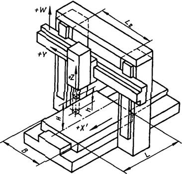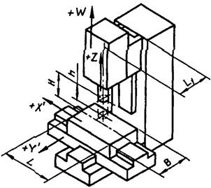 В - ширина рабочей поверхности стола; L - длина рабочей поверхности стола; h - наибольшее перемещение выдвижного шпинделя (по оси Z); H - расстояние от торца шпинделя до рабочей поверхности стола; L1 - расстояние от оси шпинделя до стойки; L2 - расстояние между стойками.