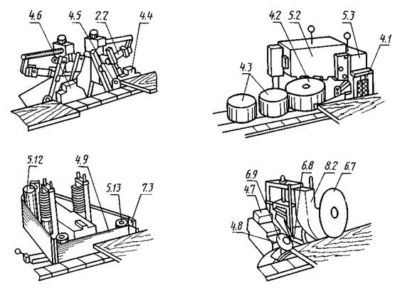 1. Основные узлы и детали кромкофанеровальных односторонних станков указаны на чертеже под соответствующими номерами.