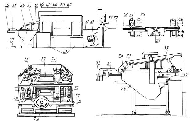 1. Основные узлы и детали шпоносклеивающих поперечных станков указаны на чертеже под соответствующими номерами.