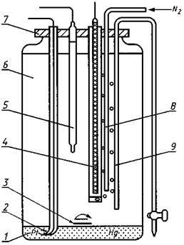 При работе со стационарным ртутным капельным электродом в полярографическую ячейку заливают 20 - 25 см3 фонового электролита, через который предварительно в течение 5 мин продувают азот или аргон, добавляют в соответствии с табл. 2 аликвотную часть испытуемого раствора, 0,01 - 0,02 г аскорбиновой кислоты и перемешивают.