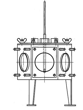 Прибор (см. черт. 1 - 4) состоит из шестигранного сосуда, на каждой стороне которого имеется круглое отверстие. Образец прижимается к сосуду напротив каждого из этих отверстий посредством зажимных пластин, которые прижимаются в соответствующем месте при помощи барашковых гаек, а кольца уплотнения помещаются между сосудом и образцами. К сосуду привинчивается крышка, имеющая четыре отверстия, - для мешалки с лопастями, двух нагревателей погружения и устройства для регулирования температуры. Между сосудом и крышкой помещается кольцо уплотнения. Мешалка с лопастями, нагреватели погружения и устройство для регулирования температуры укрепляются так, чтобы расстояния от их конца до дна сосуда были равны 30 мм.