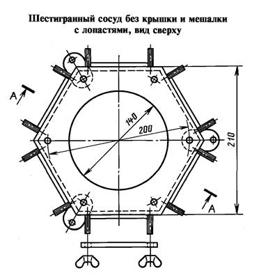 А - А шестигранного сосуда, крышки, мешалки с лопастями,
