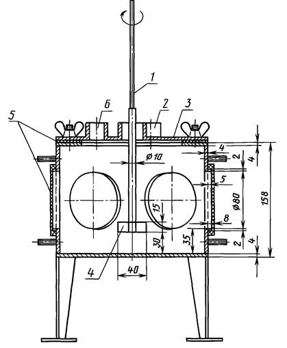 Крышка (см. черт. 1, 3, 4) должна иметь размещенный в центре держатель для установки мешалки с лопастями и три других держателя для установки нагревателей погружения и устройства для регулирования температуры.
