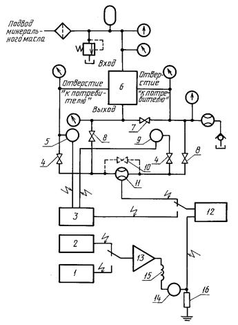 1 - генератор сигналов специальной формы; 2 - устройство ручного управления; 3 - сумматор; 4 - вентиль в гидролинии «к потребителю»; 5 - преобразователь давления; 6 - испытуемый сервоаппарат; 7 - вентиль в гидролинии слива; 8 - вентиль в гидролинии внутренней утечки; 9 - преобразователь давления; 10 - вентиль обводной линии; 11 - объемный расходомер; 12 - записывающее устройство в координатах X-Y; 13 - сервоусилитель; 14 - измеритель тока (миллиамперметр); 15 - катушка сервоаппарата; 16 - измерительное сопротивление