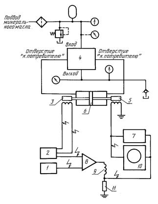 1 - источник сигнала; 2 - позиционный контур с низким усилением; 3 - преобразователь положения; 4 - испытуемый сервоаппарат; 5 - преобразователь скорости; 6 - гидроцилиндр (малый); 7 - многоканальное записывающее устройство; 8 - сервоусилитель; 9 - катушка сервоаппарата; 10 - двухлучевой осциллограф; 11 - измерительное сопротивление