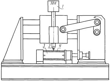 1 - нагрузка 50,0 Н; 2 - истирающий инструмент; 3 - оправка; 4 - образец испытуемого рукава