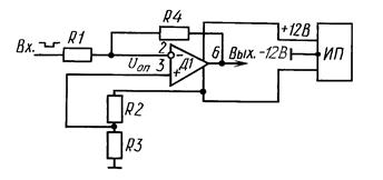 На контакт 3 усилителя Д1 подают опорное напряжение (Uоп), равное минус 3 В. При этом на входе появляется сигнал отрицательной полярности величиной минус 12 В, определяемой величиной напряжения питания микросхемы. При поступлении на вход 2 микросхемы импульса отрицательной полярности величиной минус 6 В, превышающей Uоп в 2 раза, на выходе 6 после инверсии сформируется импульс положительной полярности величиной + 12 В.