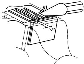 4.7. Проверку прочности сцепления слоев биметаллической ленты проводят методом долбления. Образец ленты одним концом закрепляют в тисках, зубилом шириной 12 мм вырубают канавки длиной около 30 мм, пытаясь отделить слой бронзы от стальной основы (см. черт. 2).