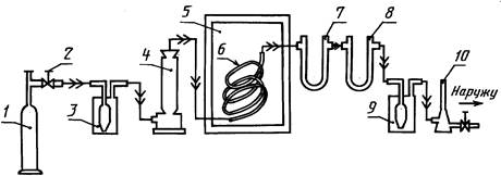 После протекания через отметчики пузырьков 9 и расходомер 10 азот выпускается в воздух.
