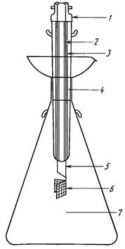 1 - штыковой цоколь; 2 - медная проволока; 3 - шлиф 24/29; 4 - платиновая проволока; 5 - плавкий стержень; 6 - держатель; 7 - колба