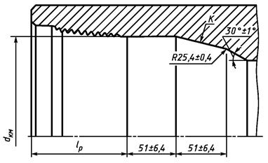 dcp - средний диаметр резьбы в основной плоскости; d1 - диаметр большего основания конуса; d2 - диаметр проточки; d3 - диаметр меньшего основания конуса; lн - длина конуса; d4 - диаметр конусной выточки в плоскости торца; d5 - внутренний диаметр резьбы в плоскости торца; lм - глубина конуса; l1 - минимальная длина резьбы с полным профилем